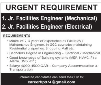 Minimum 2-3 years of experience as Facilities / Maintenance Engineer in GCC countries maintaining Residential properties, Shopping Mall etc.